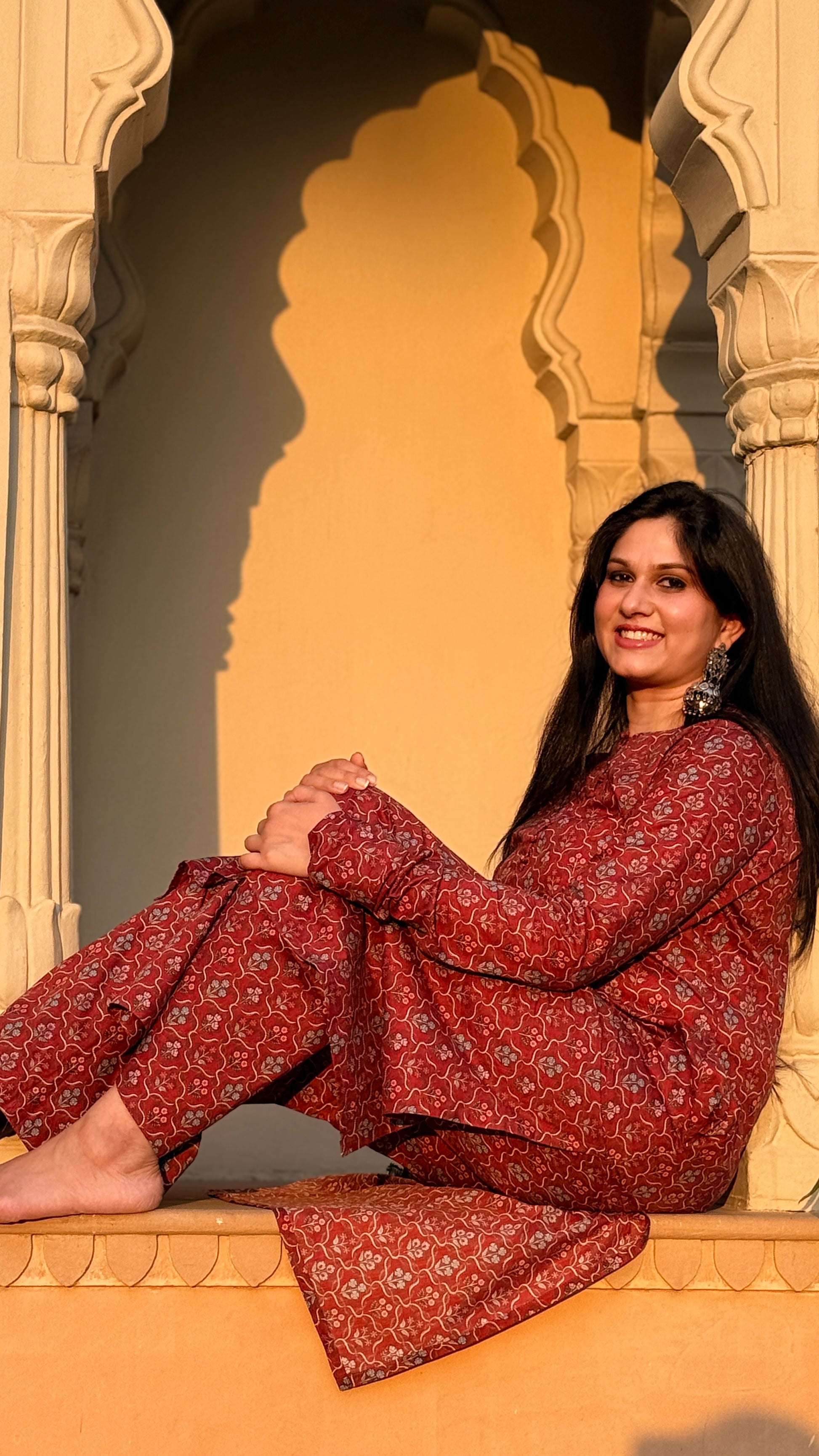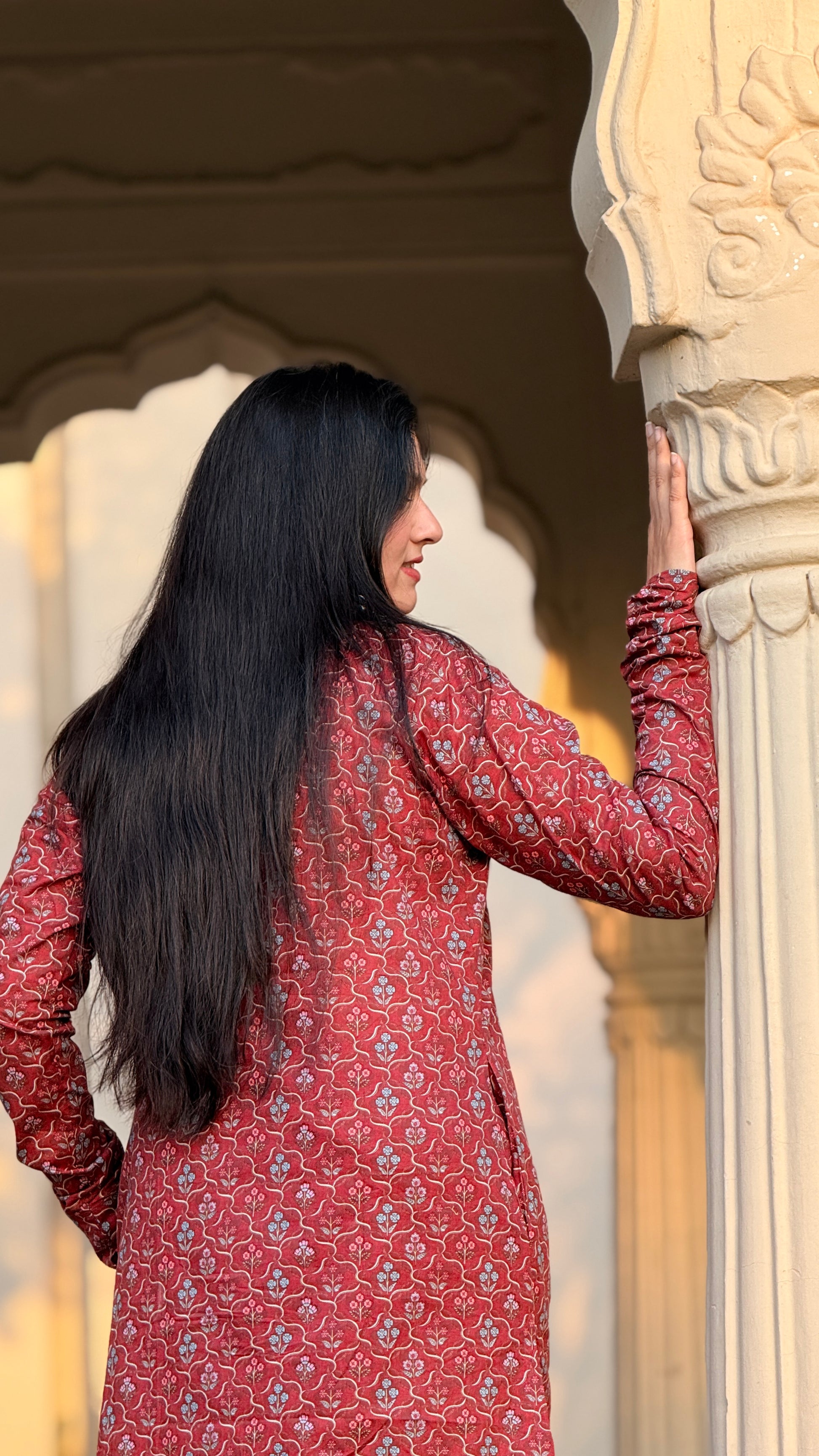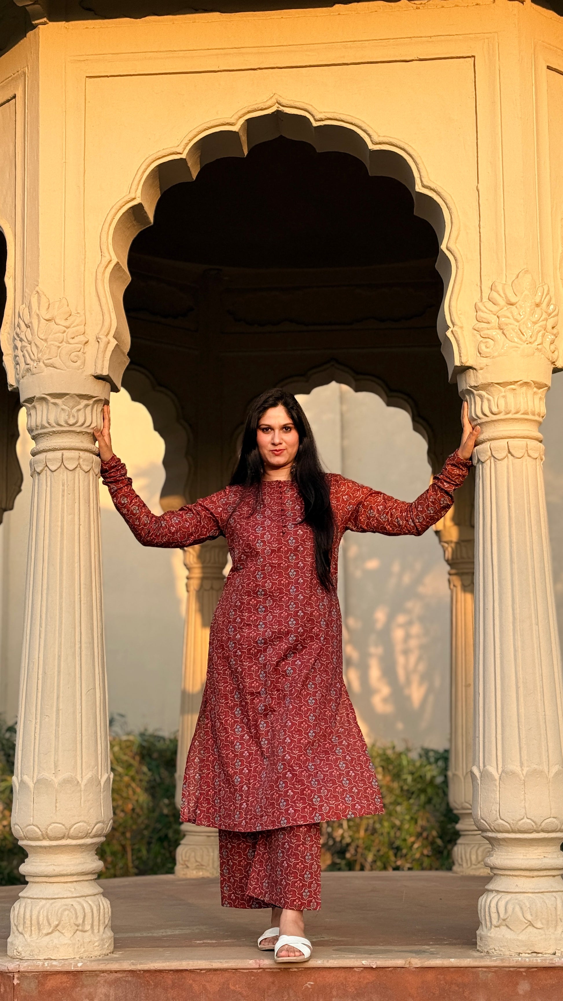 Discover understated elegance with the Poonam set, a thoughtfully designed ensemble that honors traditional aesthetics with refined simplicity. This sophisticated kurta showcases an intricate small floral print that adds visual interest without overwhelming the silhouette. Designed with functional pockets and graceful chudidaar sleeves, it pairs beautifully with straight palazzo pants for a balanced, elongated look. Ideal for celebrations, cultural events, or refined everyday styling, this set embodies timeless grace and wearable sophistication.